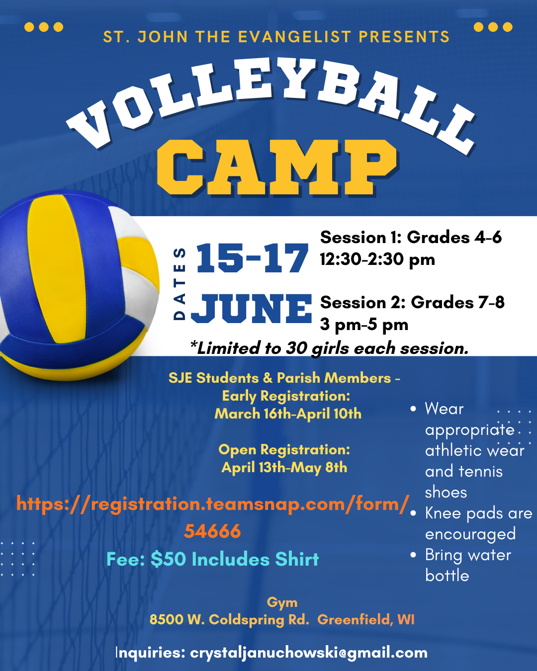 St. John The Evangelist is offering a Volleyball camp over the summer - Check out the flyer and click the button below to register.